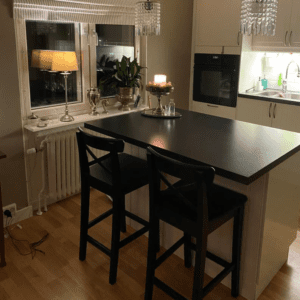 Fullt utrustat kök – matplats i form av bardisk med höga stolar, spis, kyl/frys, micro, diskmaskin m.m.